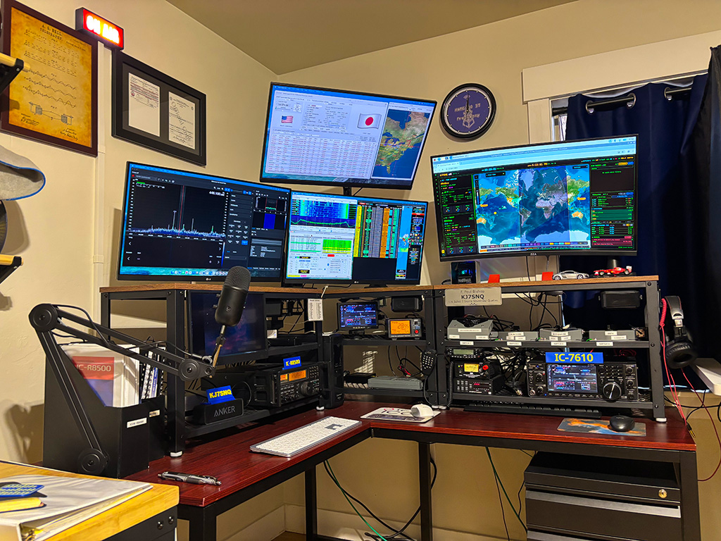 At the bottom I've added some pictures of my "Ham Shack". By way of explination – the monitor on the far right is for Software Defined Radio. The monitor just to it's right displays software showing information about FT8 contacts. The monitor above both of these is my logging software. All of the software is now run by my Mac Mini M4 computer. I used Windows for many years, but got really tired of the frustration and wasted time trying to get Windows 11 to work with all of my software packages. My Mac Mini has worked perfectly since day one, and it really fast! The large monitor on the far right is my OpenHamClock. It is run by a Raspberry Pi 5 computer that is sitting just below the far left edge of this monitor. Oh yes – the small 10 in screen on the lower left (in the last picture) is a digital picture frame that shows some of the images I took with me telescope. That's about it – thanks for looking. If you are still interested the paragraphs below give a little more information about Ham Radio.