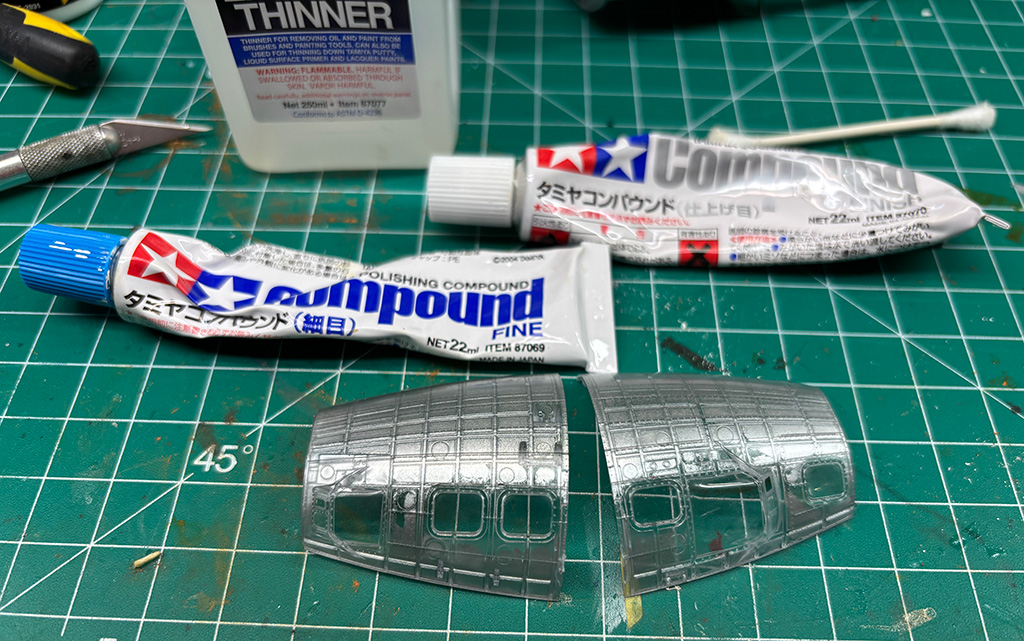 Before you paint clear parts with a rattle can, be sure and attach the window masks. I had to clean the paint off with Tamiya lacquer thinner followed by Tamiya polishing paste. Finally I washed the parts in a Dawn dishsoap solution and dried with a microfiber cloth. The result is as good as new, but I wish I had my brain in gear when I painted these in the first place.