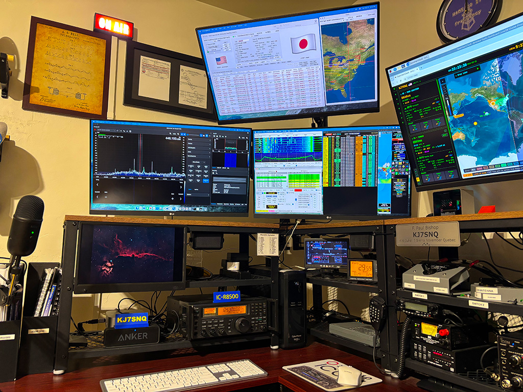 At the bottom I've added some pictures of my "Ham Shack". By way of explination – the monitor on the far right is for Software Defined Radio. The monitor just to it's right displays software showing information about FT8 contacts. The monitor above both of these is my logging software. All of the software is now run by my Mac Mini M4 computer. I used Windows for many years, but got really tired of the frustration and wasted time trying to get Windows 11 to work with all of my software packages. My Mac Mini has worked perfectly since day one, and it really fast! The large monitor on the far right is my OpenHamClock. It is run by a Raspberry Pi 5 computer that is sitting just below the far left edge of this monitor.  Oh yes – the small 10 in screen on the lower left (in the last picture) is a digital picture frame that shows some of the images I took with me telescope. That's about it – thanks for looking. If you are still interested the paragraphs below give a little more information about Ham Radio.